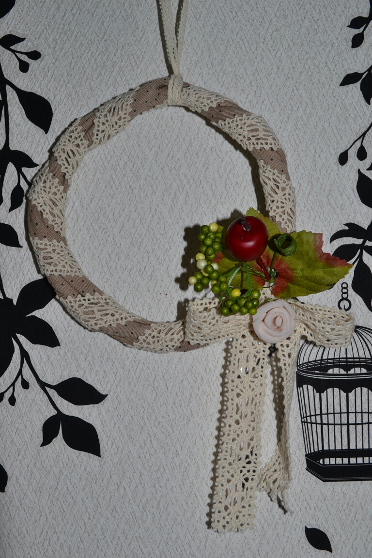 卜ーションレースを巻きつけて、リンゴの飾りとリボン結びにしたレースをあしらいました。