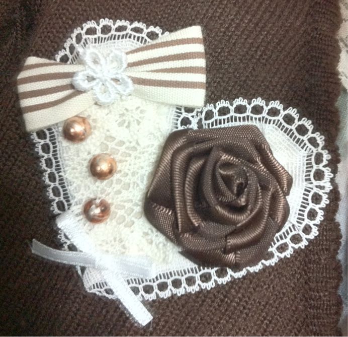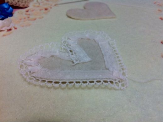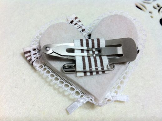 もう一枚のハートに、スリーピンが通る幅をとってリボンを縫い止めます。