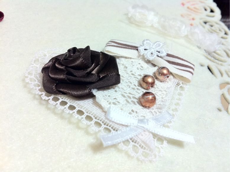 バランスを見ながら、トーションレースやリボン、バラやビーズなどパーツを載せて縫い止めていきます。
