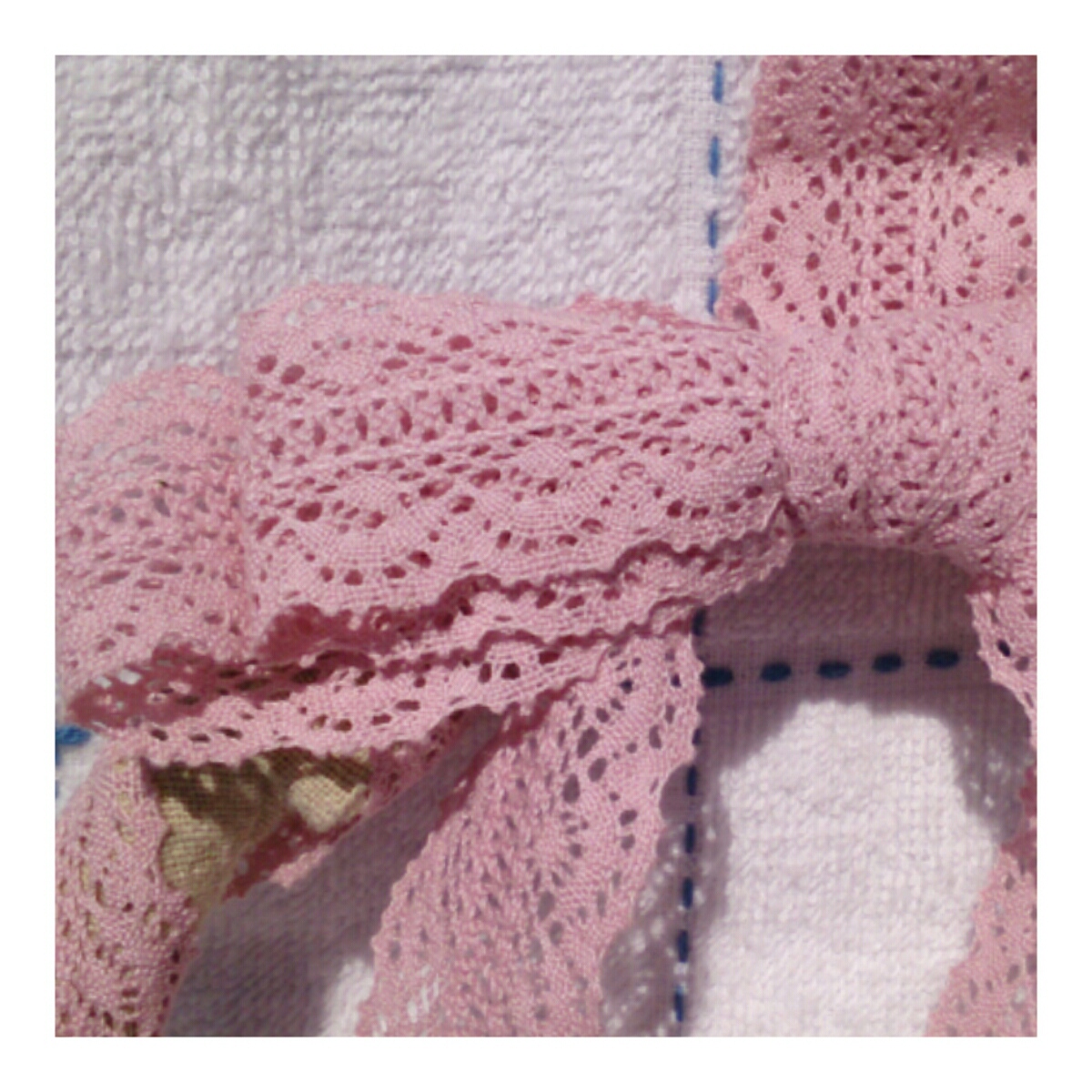 麻布のリース台にピンクのレースを巻いたリースを作りました。