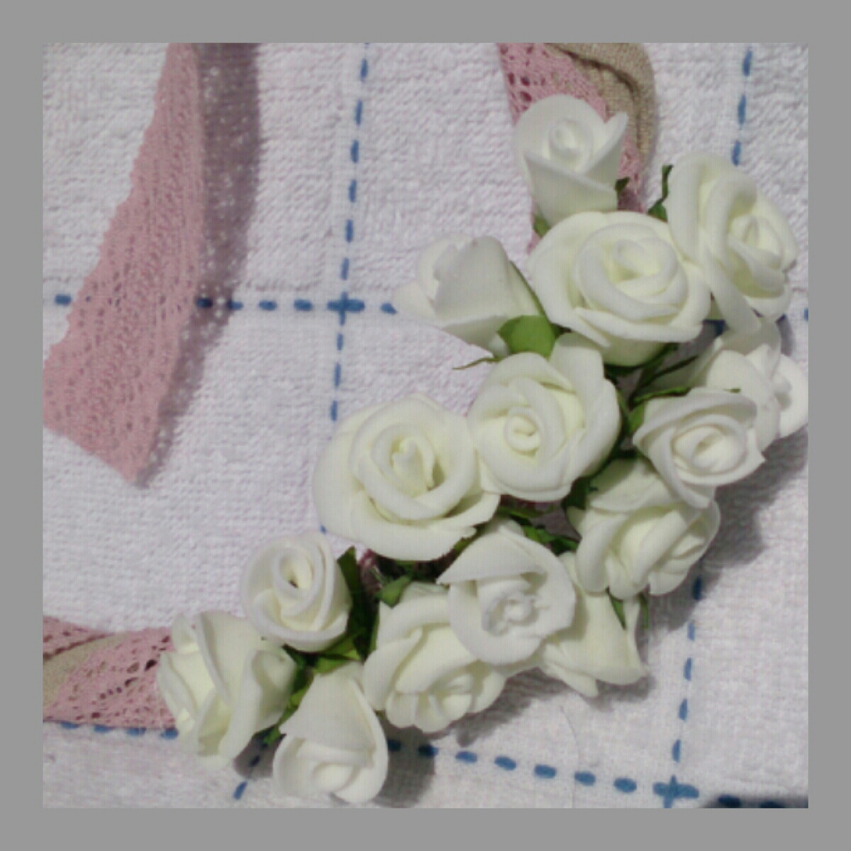 小さめのホワイトローズの造花をたっぷり使って、小ぶりですが、存在感のあるリースになりました。