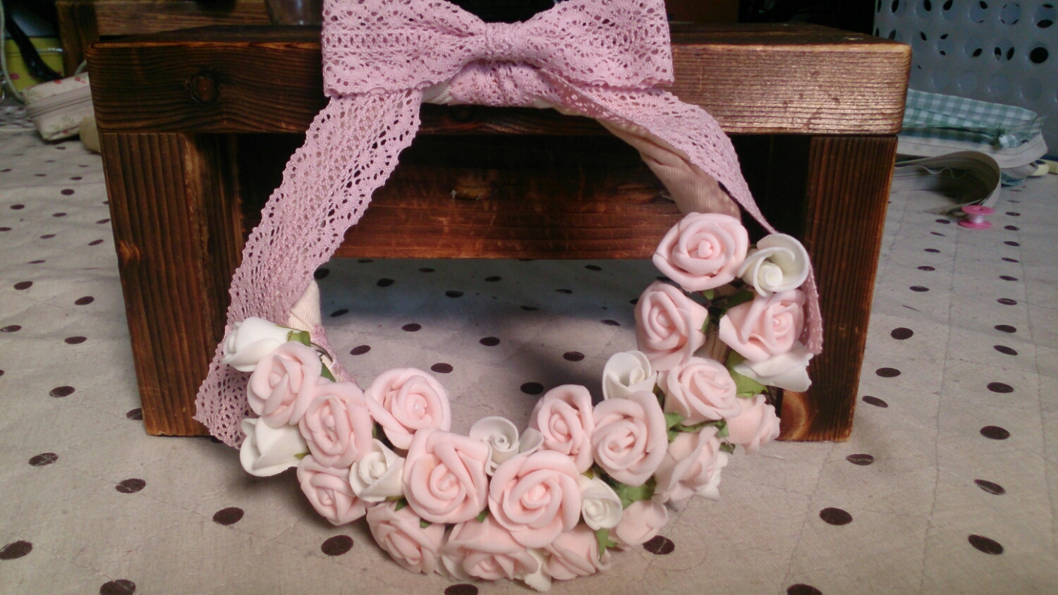 ホワイトとピンクの小さいバラをたくさん使って、ボリュームのあるリースができました。