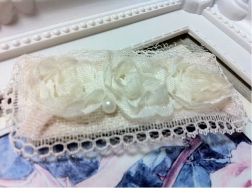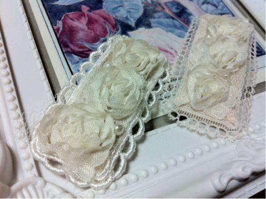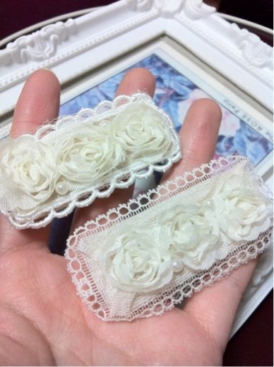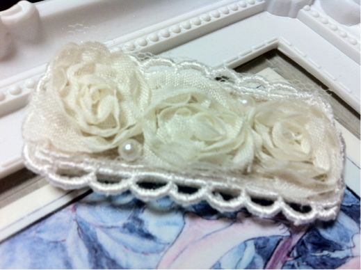 お花パーツと縫い留めたパールビーズは共通で。こちらはベースに薄ピンクのレースを。