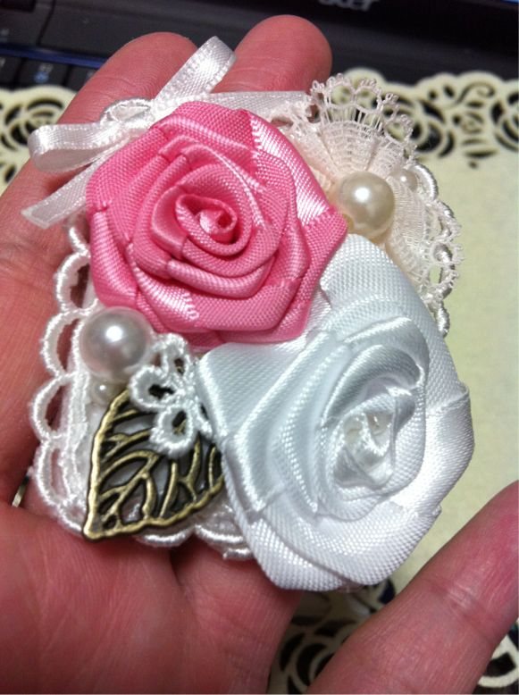 ピンクと白のバラを並べた額縁風ブローチです。金古美色の葉っぱ型パーツにパールビーズ、淡いピンクのチュールレースにサテンのプチリボンと盛りだくさんのブローチです^ ^