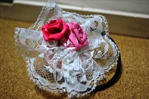 お子様向けでしょうか、パリッとしたラッセルレースに赤とピンクのバラをのせたヘアゴムです。パールや小さなサテンリボンもついています。