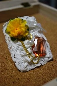 こちらは黄色い造花の額縁風ブローチです。チェーンやビジューパーツできらきらした仕上がりです。