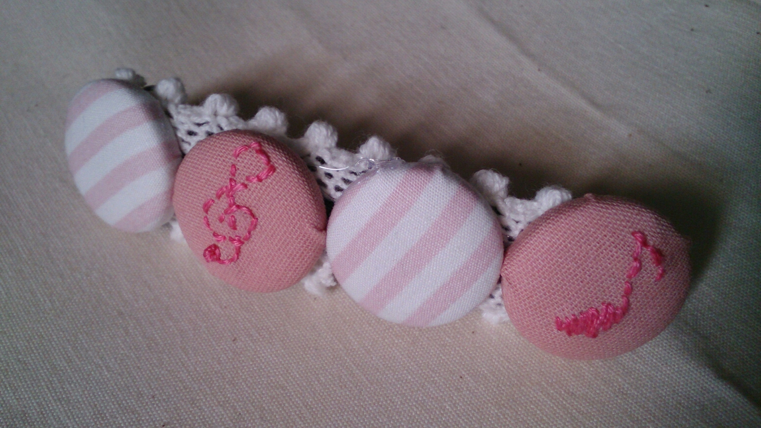 クルミボタンを使った髪飾りと、革製モチーフを使ったバレッタを作りました。