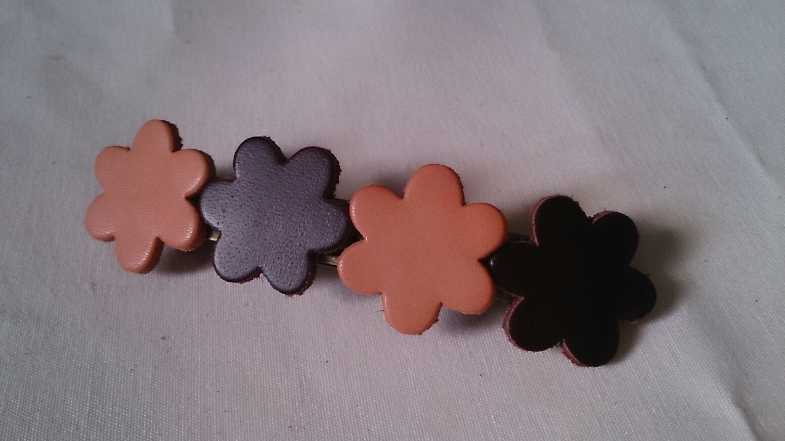 昨年、日暮里で衝動買いしたお花の形の本革モチーフを使ったバレッタです。お洋服を選ばず、色々な場面で使っていただけそうです♪