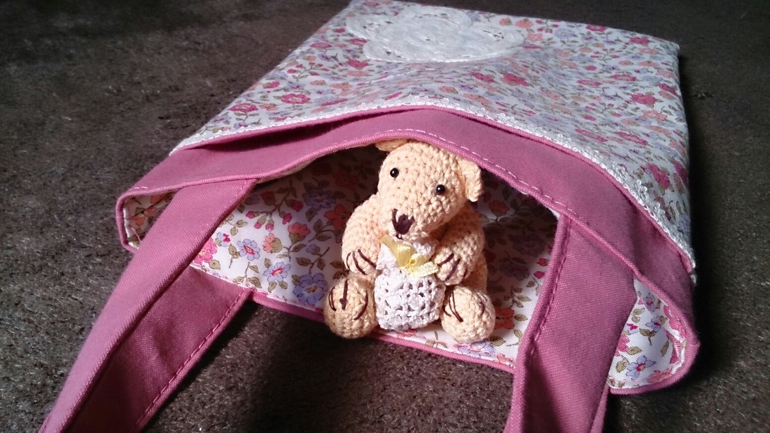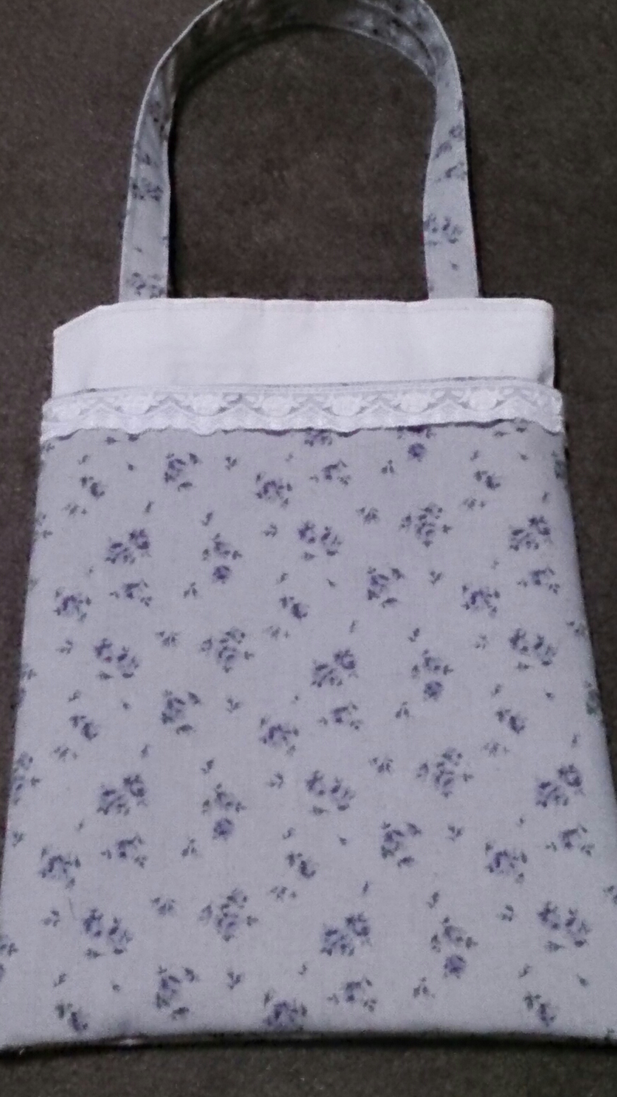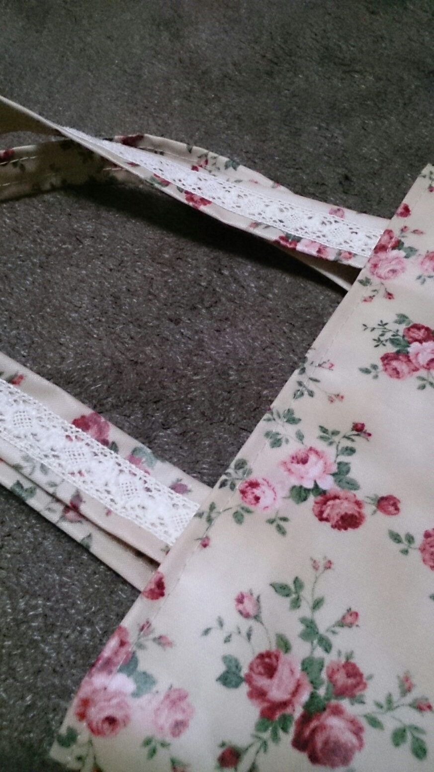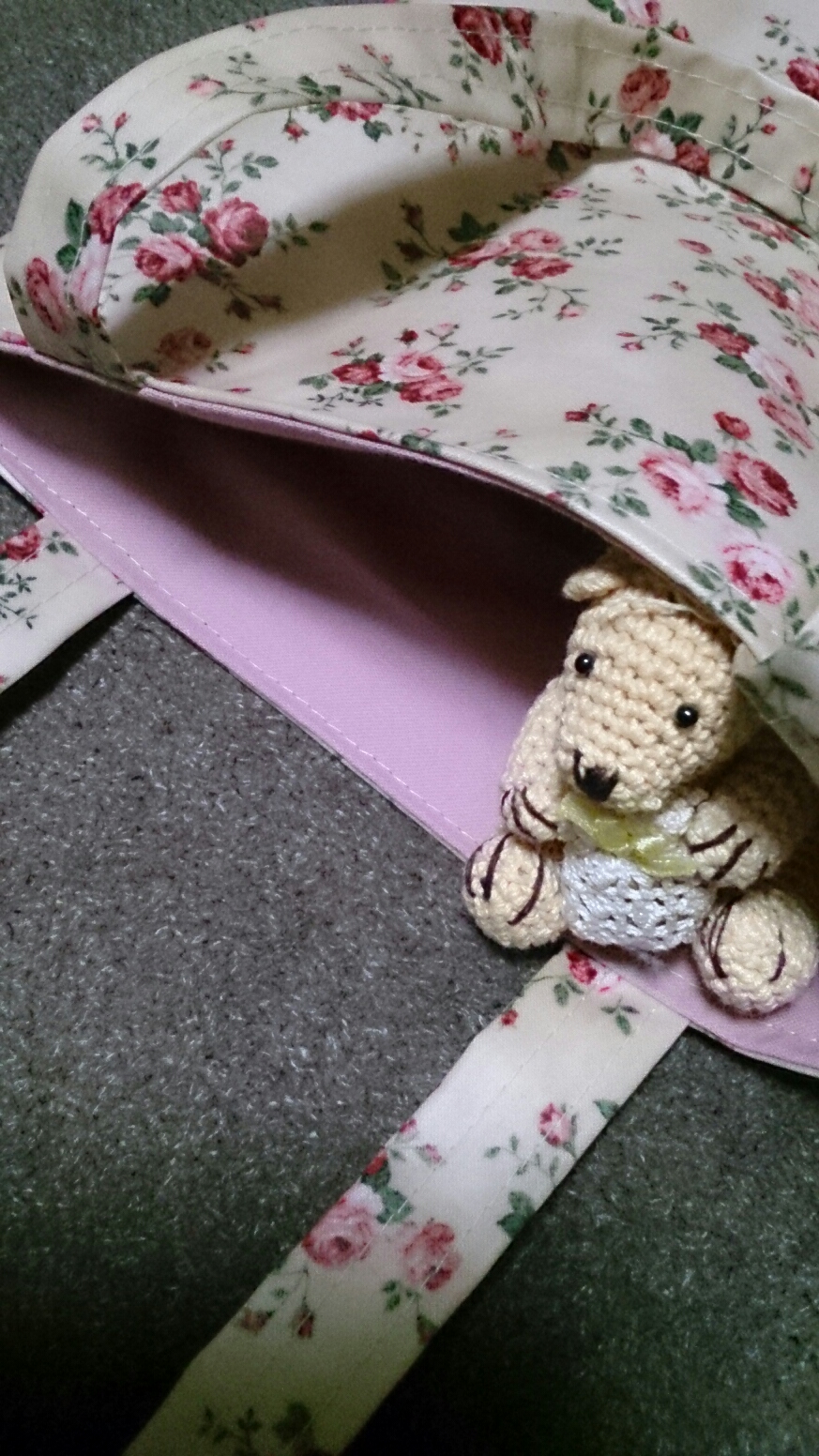 両面に大きめのポケットのあるペタンコバッグをピンクの小花柄と無地を組み合わせて作ってみました。