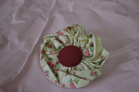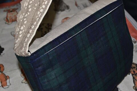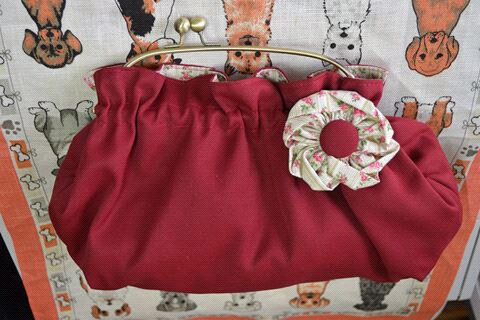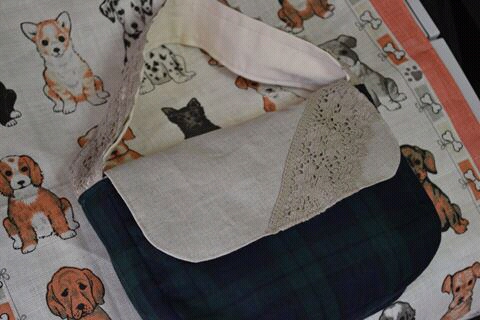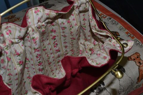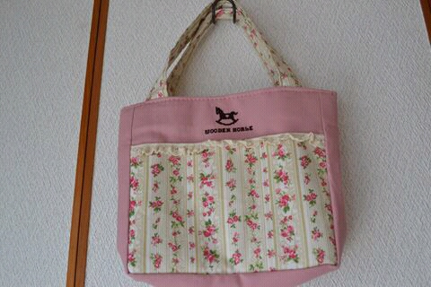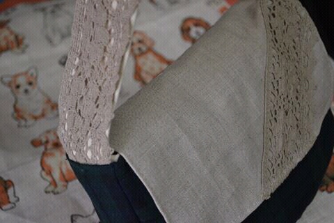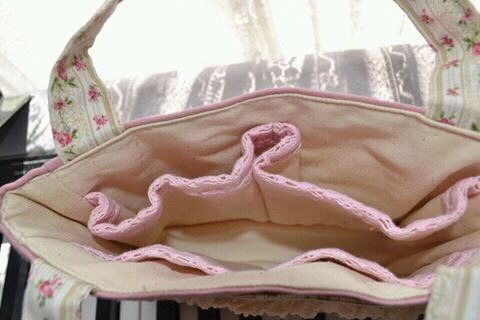 ポケット口と肩ひもには渋めのピンクのトーションレースを縫い付けました。
