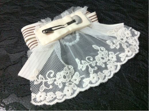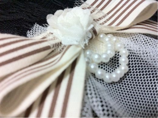 きなり色のチュールレースに、コットンの木の実や葉っぱのようなレース、ゴールドのチェーン、えんじ色のリボンを載せました(^^)