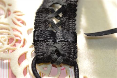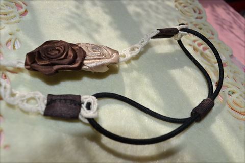 お花パーツと縫い留めたパールビーズは共通で。こちらはベースに薄ピンクのレースを。