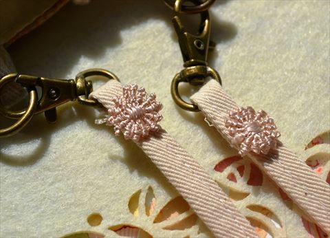取り外せる持ち手の金具はアンティークゴールド。淡いピンクの繊細な花モチーフをポイントに。