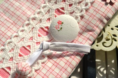 繊細なトーションレースをくるみボタンに巻きつけてとめるデザインです。