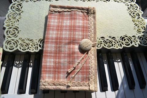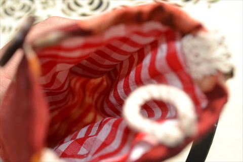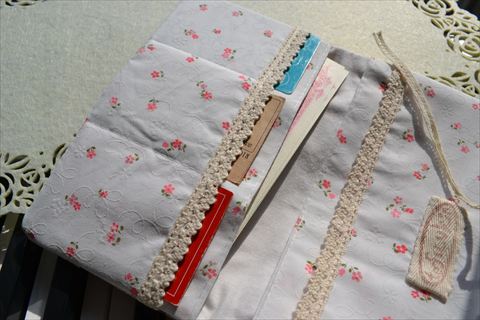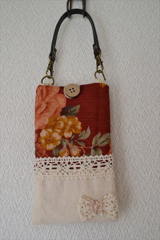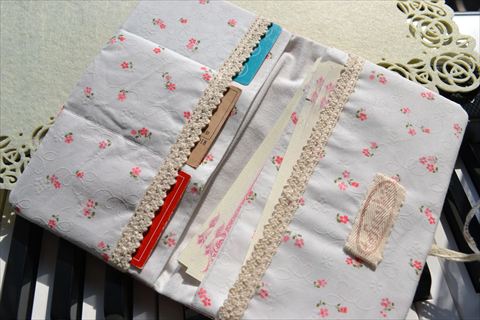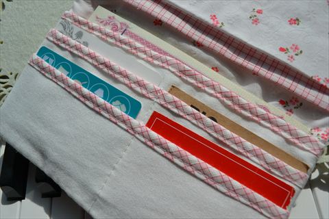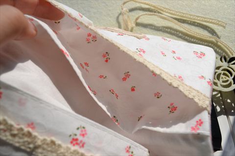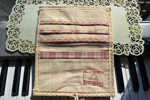 縦に3つのカードポケット。入れ口にはトーションレースを。後ろには大ポケットも一つ^^
