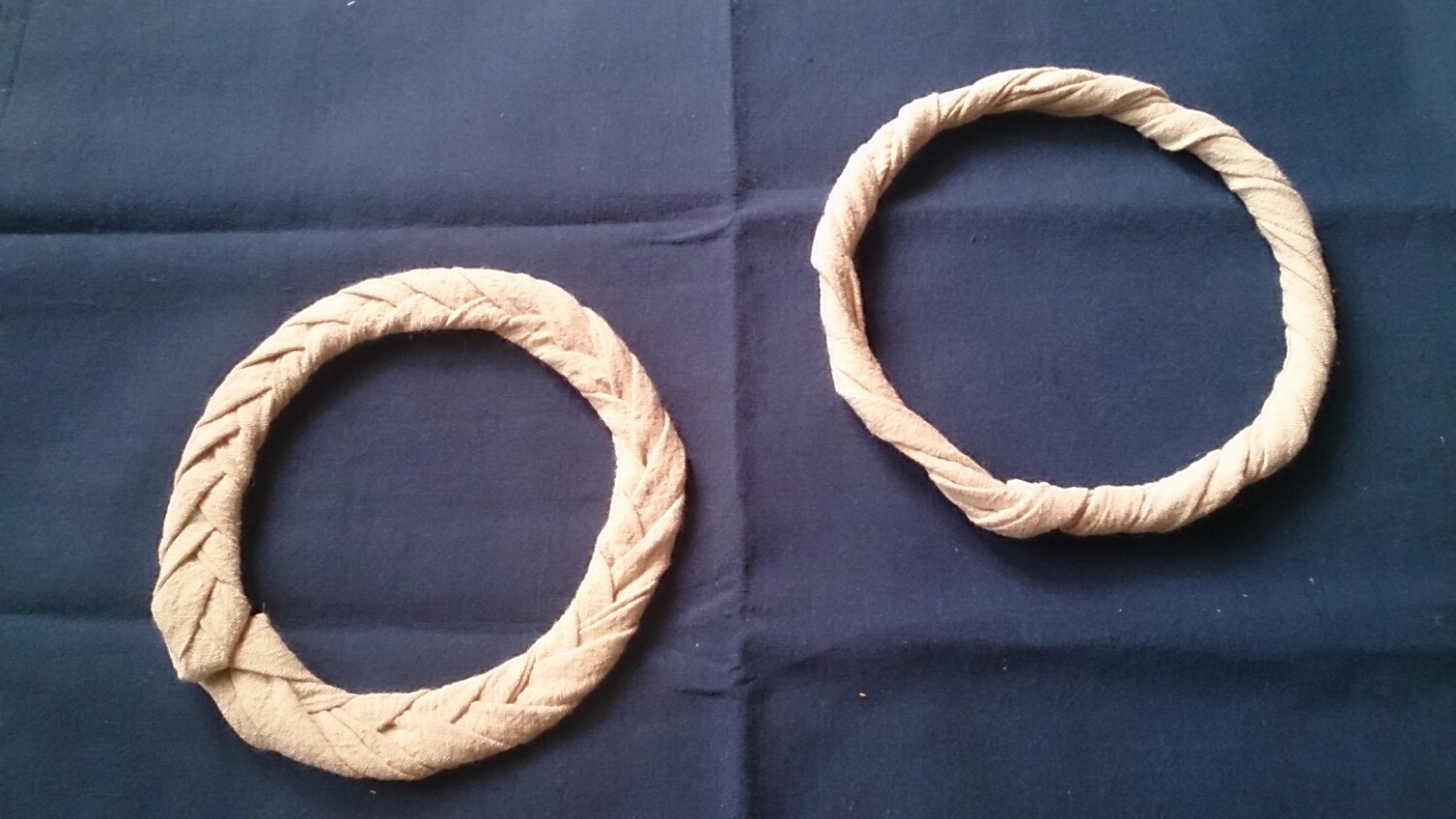 蔦で作るときのようにぐるぐる巻いたタイプと、ヘリンボーンに編んだタイプの2種類にしてみました。