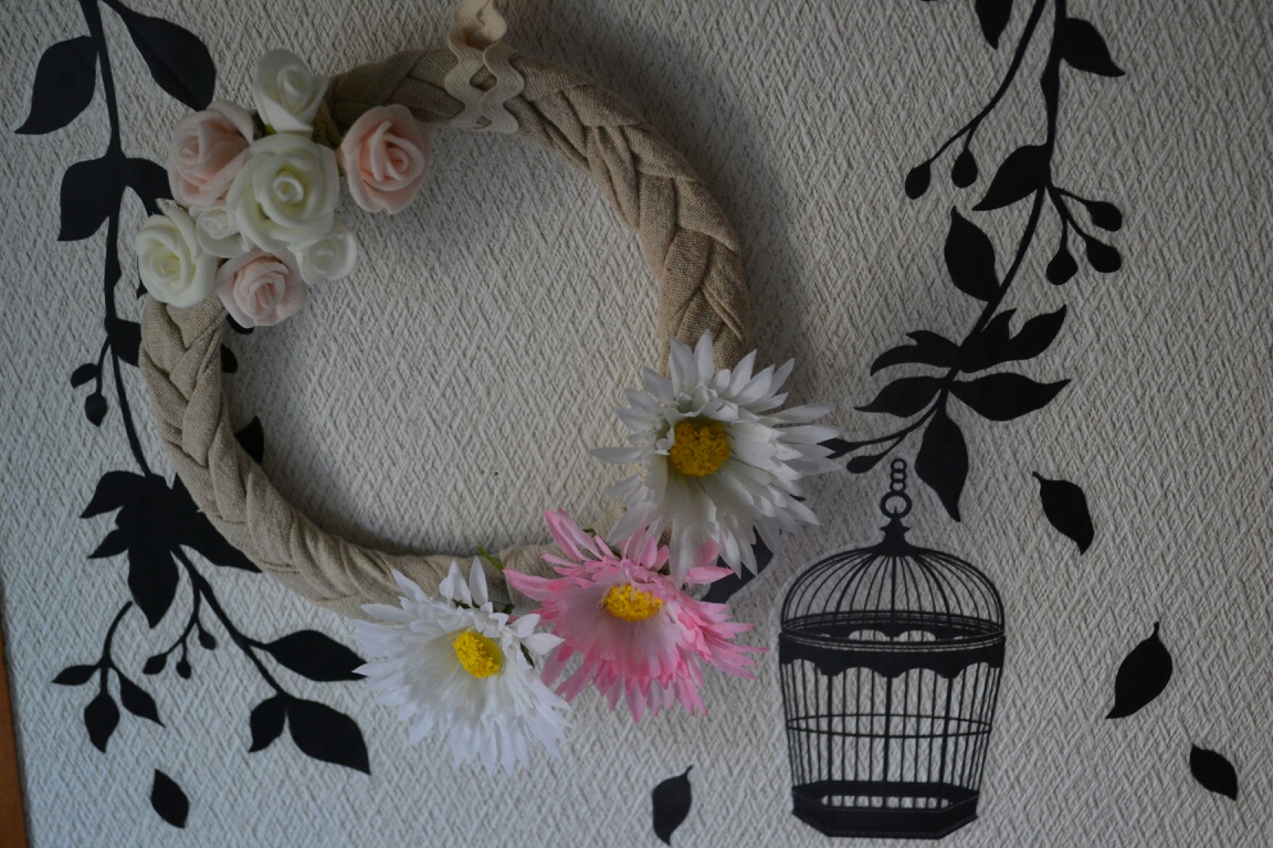 細く切った麻布と針金を組み合わせてリース台を作りました。