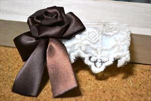 こげ茶のサテンリボンと茶色ストライプのコットンリボンにチュール素材のお花を縫い留めました。