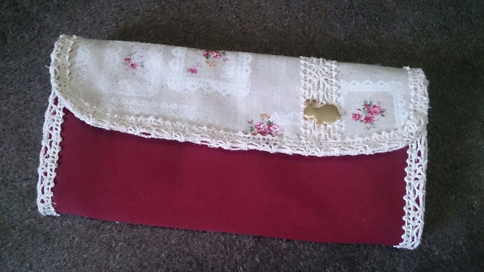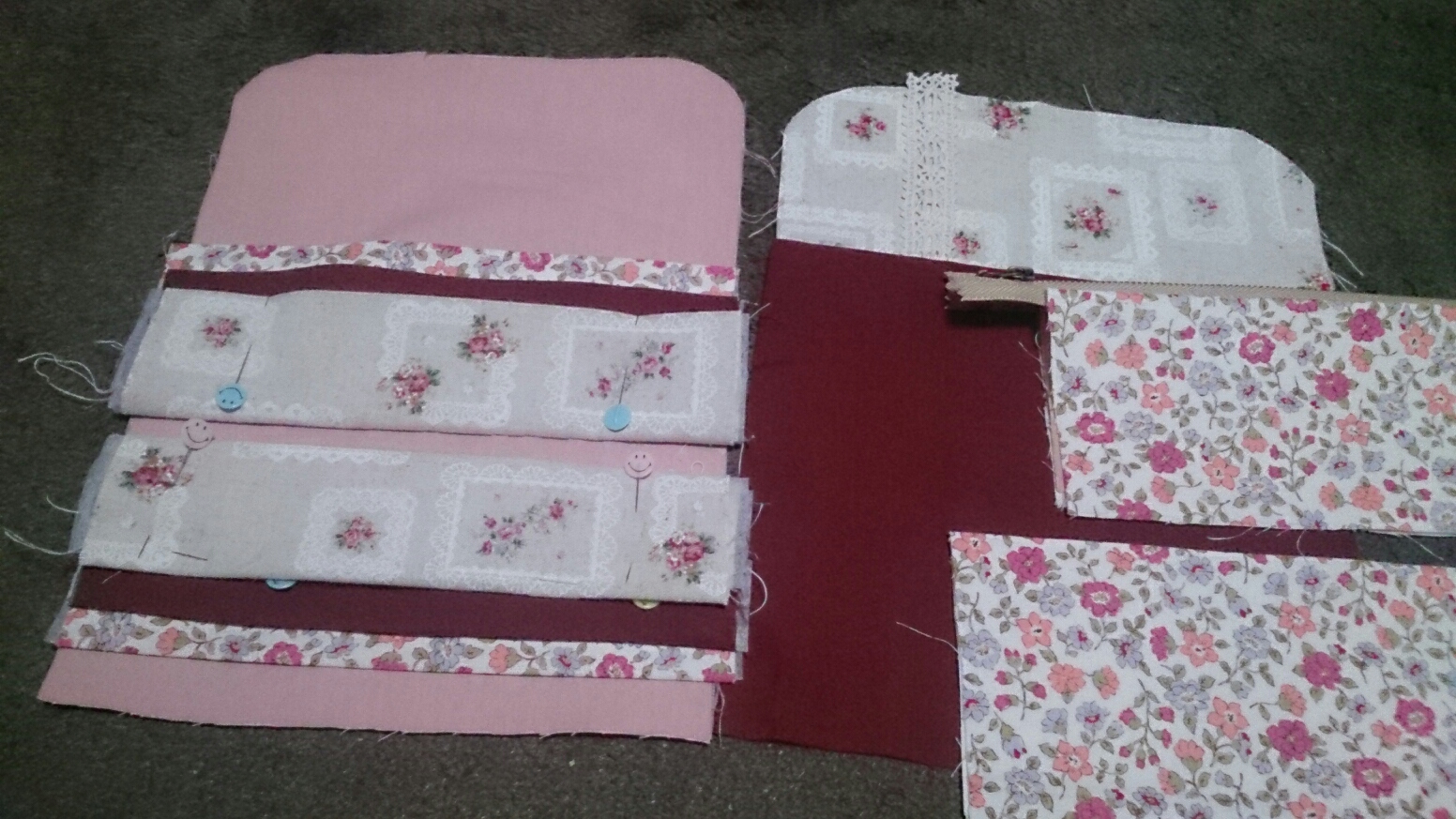 外ポケット2つ、表側は紫のレースで縁取りしました。
