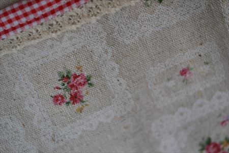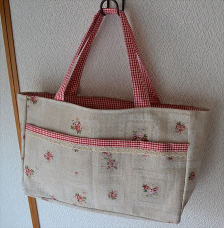 リネンに額縁とバラのプリントの素敵な生地と、定番の赤ギンガムを合わせたバッグインバッグです^^