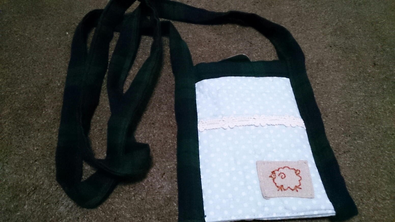 水色に白のドット模様、ポイントに羊を刺繍しました。ショルダー紐はダブルガーゼのブラックウォッチでとても良い手触りです。