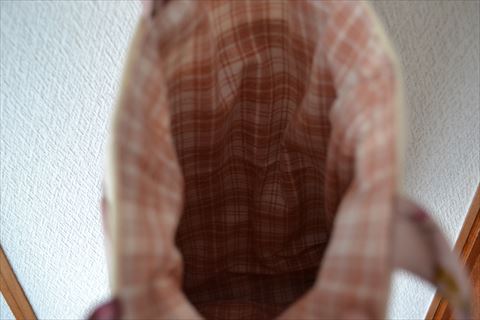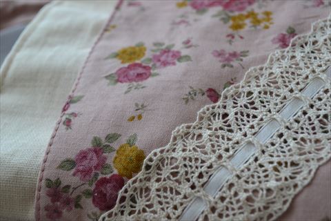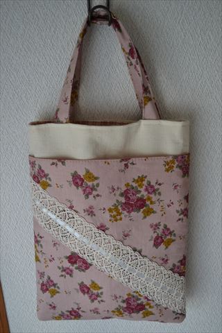 いつもの全面ポケット2個。表はきなりの生地と合わせたきなりの幅広トーションレースを。