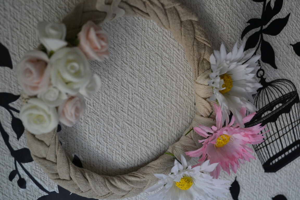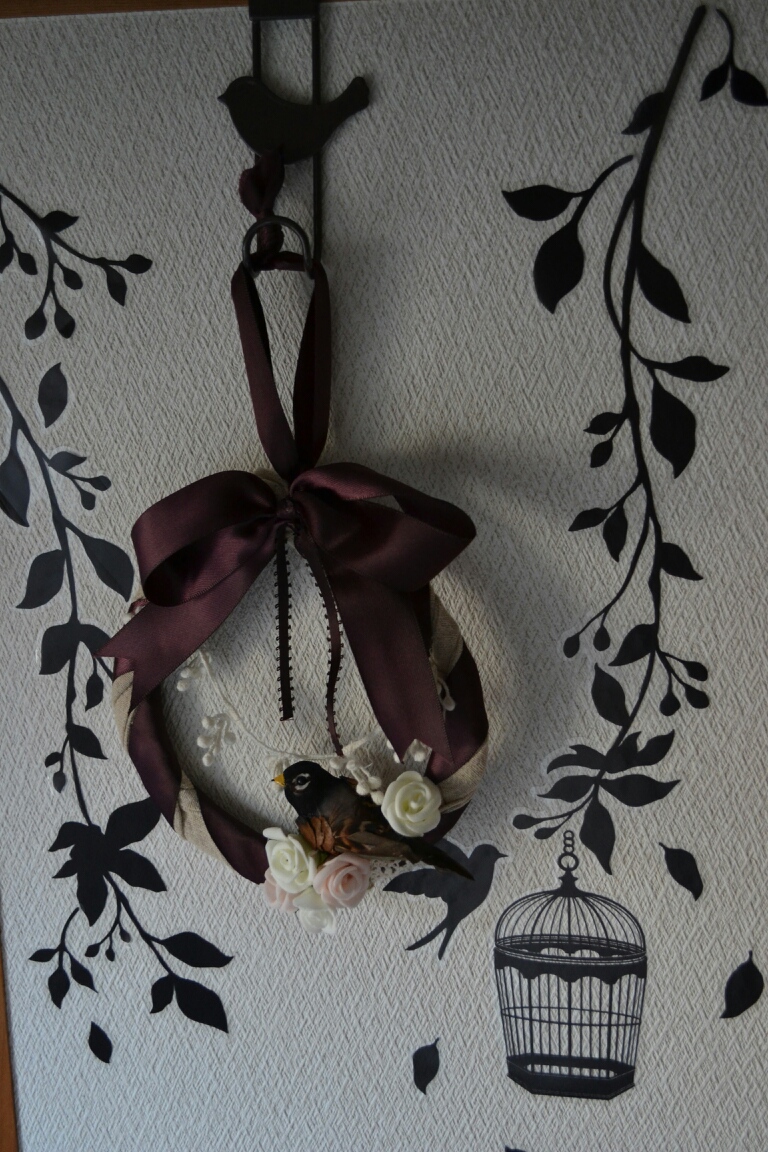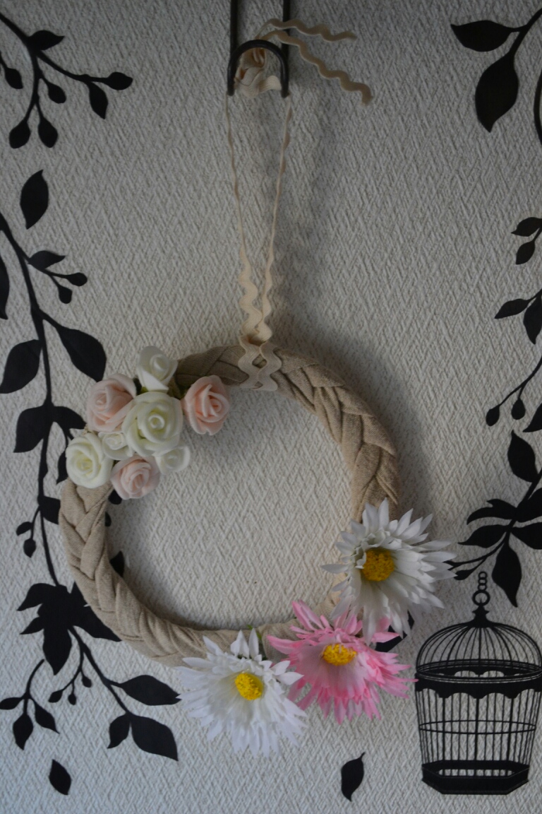 細く切った麻布と針金を組み合わせてリース台を作りました。