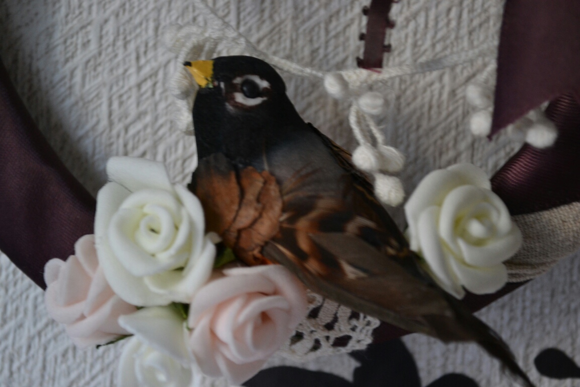 オレンジ色の小鳥とオレンジ色の薔薇、白のガーベラ、トーションレースと焦げ茶のリボン!