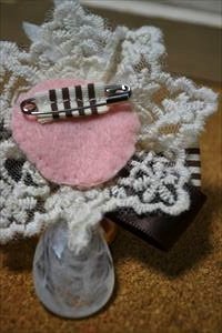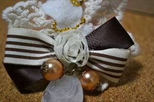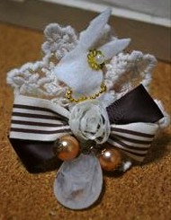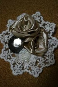 こげ茶のサテンリボンと茶色ストライプのコットンリボンにチュール素材のお花を縫い留めました。