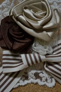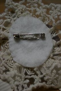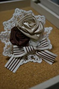 サテンリボンの巻きバラと、同じ素材のリボンを、たっぷりフリルを寄せたブラックのレースの上に載せました。裏はブローチピンです。しっかり縫い留めてあります。土台も一周しっかり手縫いをしていますので、丈夫です。蛍光灯の下での撮影のため青が強くでていますが、実際はもう少し落ち着いた色の印象です。