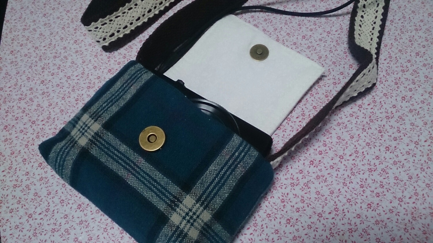 内側にはレースを使ったポケットと、雑誌やファイルを入れても倒れてこないように、仕切りのような大きいポケットを付けました。