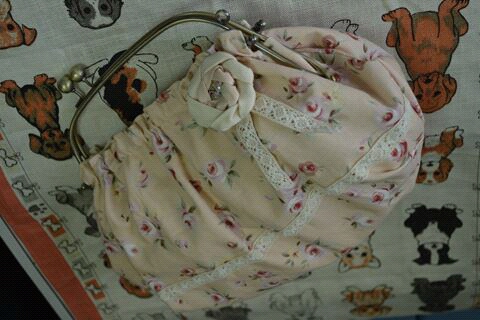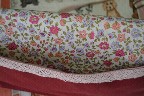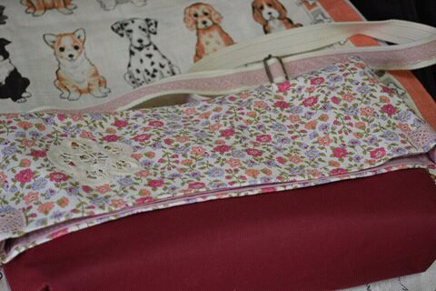 ポケット口と肩ひもには渋めのピンクのトーションレースを縫い付けました。