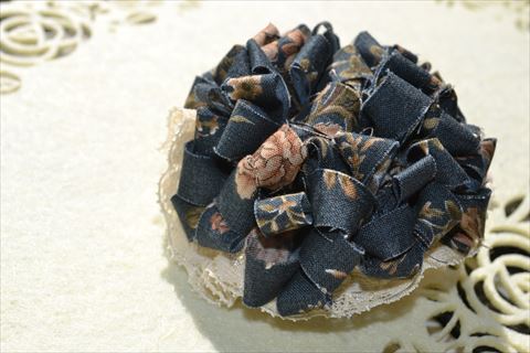 一昨日ご紹介したバッグとセットのブローチはこれよりひとまわり小さめに作ってあるので、色味の合うものを2個付けしても可愛くなりそうですね♪